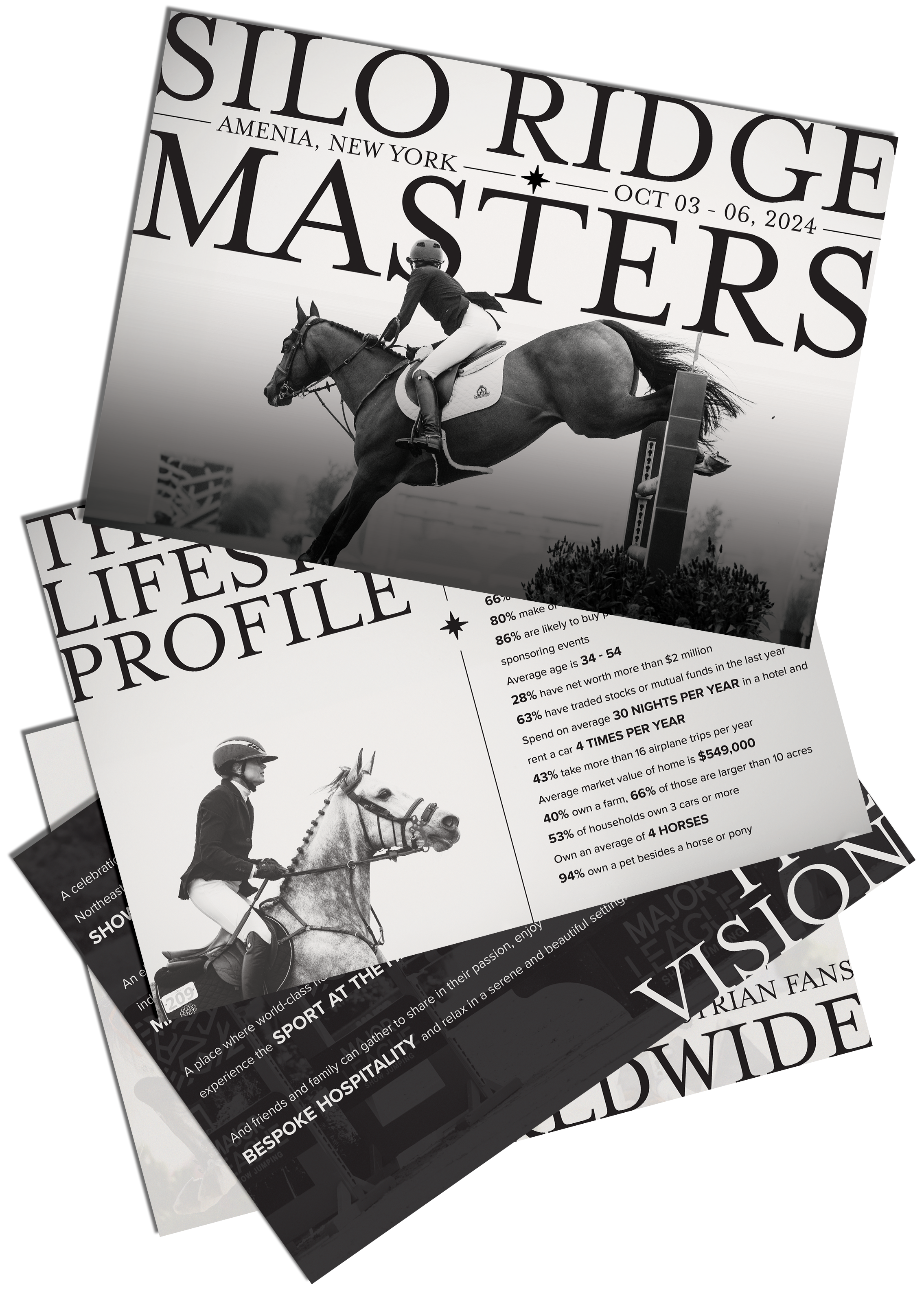 As MMG expanded its portfolio of horse shows, I was later brought in to help bring a new New York equestrian experience to life during its early stages of development. Through my graphic design work on the Silo Ridge Masters Sponsorship Deck (now known as the Highlands Horse Show), I supported the launch of the event by creating document layouts, custom iconography, and tailored imagery while the brand identity was still being defined. These assets helped potential sponsors visualize their role in an elite, not-yet-built event, provided the web development team with foundational graphics, and allowed venue hosts to see their branding reflected as early stakeholders in the show’s future.